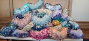 Each year, members gather at tables in the parish’s community room to assemble 100 pillows. They have a variety of pastel-colored fabrics and instead of sewing, they hand-tie each heart-shaped pillow before stuffing them.